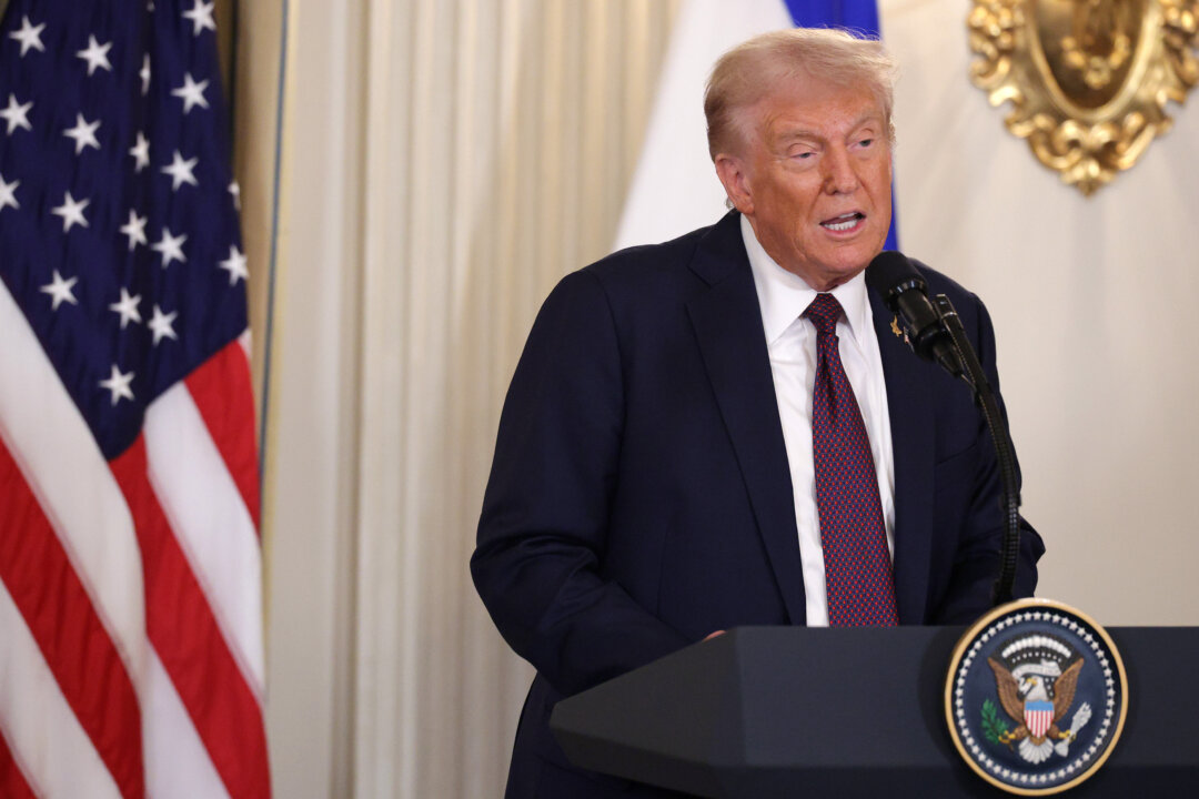 U.S. President Donald Trump delivers remarks during a joint news conference with Israeli Prime Minister Benjamin Netanyahu in the State Dining Room at the White House on Sept. 29, 2025. Alex Wong/Getty Images