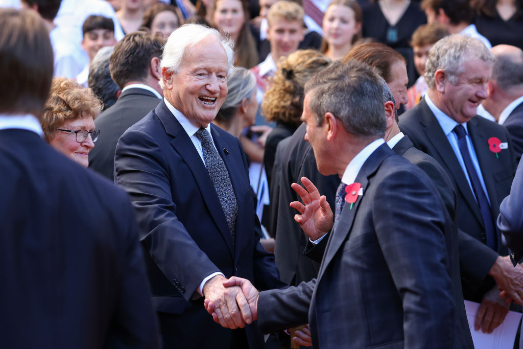 Former Prime Minister Jim Bolger shakes hands with National MP Michael Woodhouse after the State Memorial Service for Prince Philip, Duke of Edinburgh, at the Wellington Cathedral of St Paul in Wellington, New Zealand, on April 21, 2021. Hagen Hopkins/Getty Images