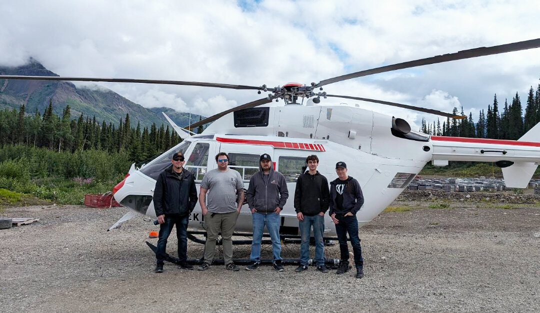 Barry Nabess (director of EHS & Safety), left to right, Kevin Coumbs (driller), Jesse Chubaty (driller), Darien Maduke (driller helper), and Dwayne Ross (president) pictured in front of the helicopter taking them home following their safe return to the surface after the Red Chris Mine ground fall incident as shown in this handout image. The Canadian Press/Handout – Hy-Tech Drilling