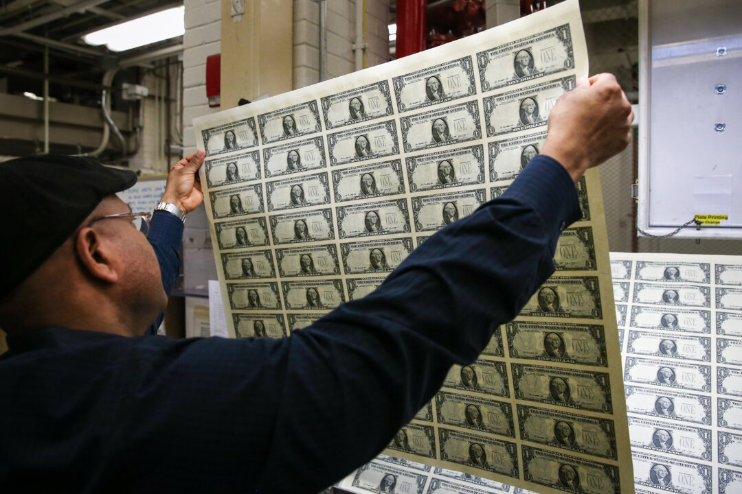 Printing Supervisor Donavan Elliott inspects newly printed sheets of one dollar bills at the Bureau of Engraving and Printing in Washington on March 24, 2015. Mark Wilson/Getty Images