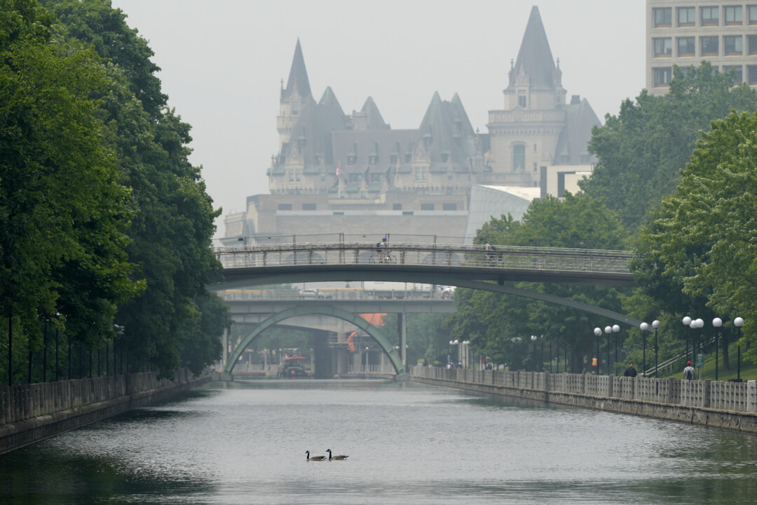Two geese float on the Rideau Canal as buildings are obscured with haze from wildfires burning in Canada’s prairie provinces, in Ottawa on June 6, 2025. The Canadian Press/Adrian Wyld