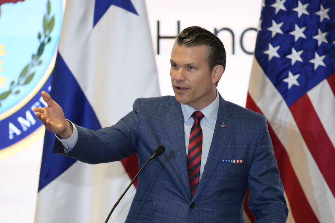U.S. Defense Secretary Pete Hegseth greets Salvadoran Defense Minister René Francis Merino Monroy and holds a bilateral meeting at 10 a.m. ET on April 16.