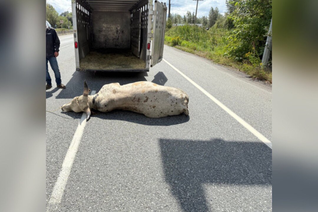 Abbotsford police say in a social media post that its emergency crews were on scene to deal with a bull loose on Highway 11, and that a stretch of the highway had to be closed in both directions to ensure public safety.