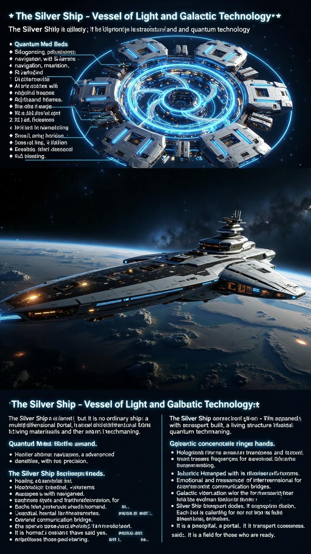 I’m Heron, Commander of the Silver Ship, and I’m here to invite you to join me on an epic adventure that will take you to discover your true nature and reach new dimensions of consciousness. The Argentata ship is a marvel of advanced technology, equipped with tools and systems that will allow you to explore the universe and discover the truth about your multidimensional nature. The ship is built with advanced materials that allow it to travel at incredible speeds and cross dimensions, giving you a unique and unforgettable experience.