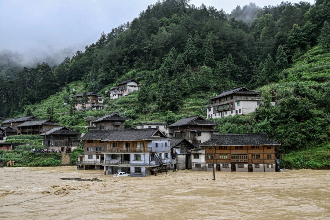 Submerged buildings at a flood-affected village in Kaili, in southwestern Guizhou Province, China, on June 28, 2025. STR/AFP via Getty Images