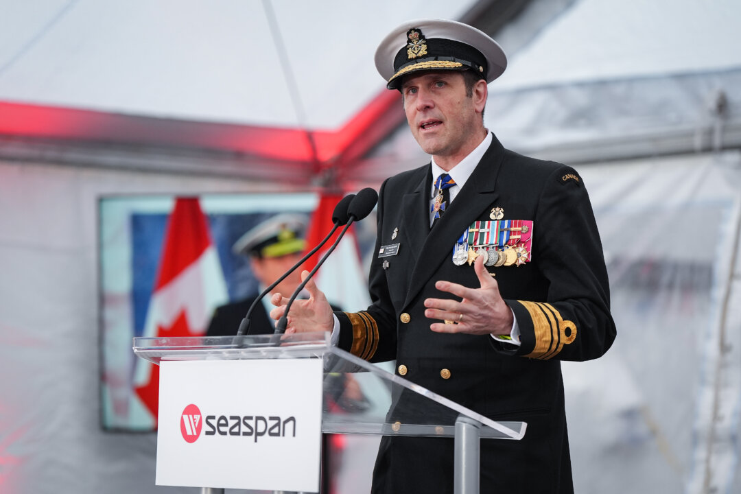 Vice-Admiral Angus Topshee, commander of the Royal Canadian Navy, speaks at Seaspan Shipyards in North Vancouver, B.C., on Dec. 13, 2024. The Canadian Press/Darryl Dyck