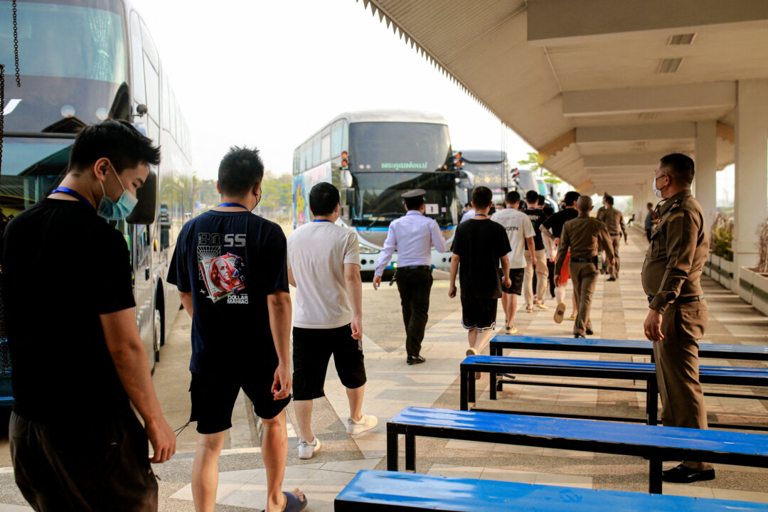 Scam center workers and victims from China arrive at the border checkpoint with Thailand, in Myawaddy, Burma, on Feb. 20, 2025. Hundreds of Chinese workers were heading home after being freed from online scam centers. STR/AFP via Getty Images