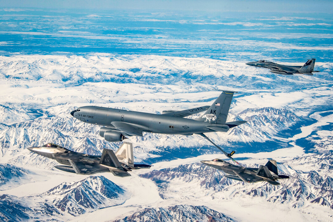 A KC-135 Stratotanker from the 168th Air Refueling Wing refuels F-22 Raptors from the 3rd Wing over the Joint Pacific Alaska Range Complex flying along side with an F-15 Eagles from the 144th Fighter Wing, on April 18, 2022. Air National Guard photo by Master Sgt. Charles VaughnThe North American Aerospace Defense Command (NORAD) on Feb. 19 said it detected and tracked Russian military aircraft operating in the Alaskan Air Defense Identification Zone (ADIZ).NORAD said in a statement that two Tu-95 strategic bombers, two Su-35 fighter jets, and one Beriev A-50 surveillance aircraft were flying through the zone in international airspace.