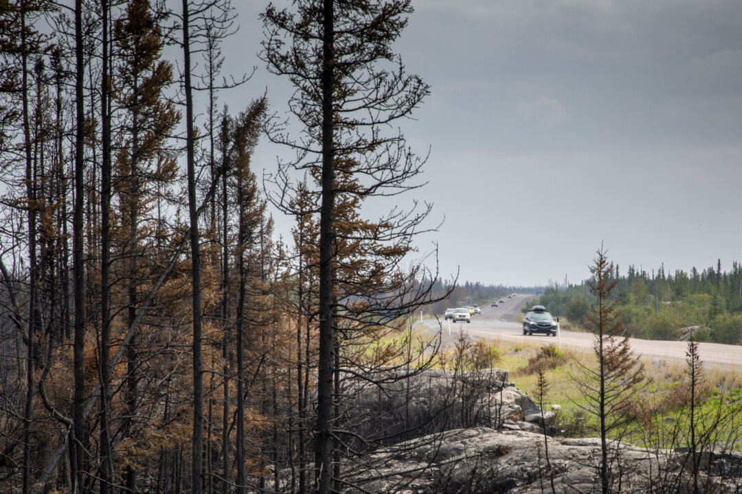 Evacuees from Yellowknife make their way along Highway 3 at the edge of a burned forest on their way to Fort Providence, N.W.T., on Aug. 17, 2023. The Canadian Press/Bill Braden