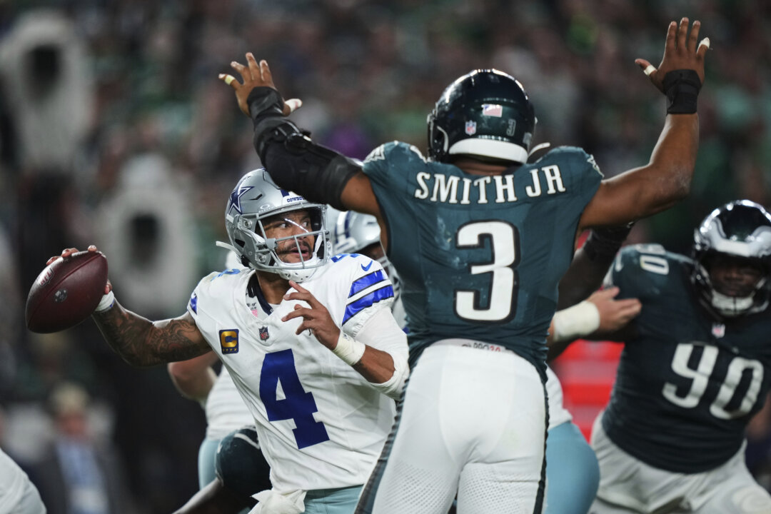 Dallas Cowboys quarterback Dak Prescott (4) throws a pass under pressure from Philadelphia Eagles linebacker Nolan Smith Jr. (3) in the second half of an NFL football game on Sept. 5, 2025, in Philadelphia. AP Photo/Matt Slocum