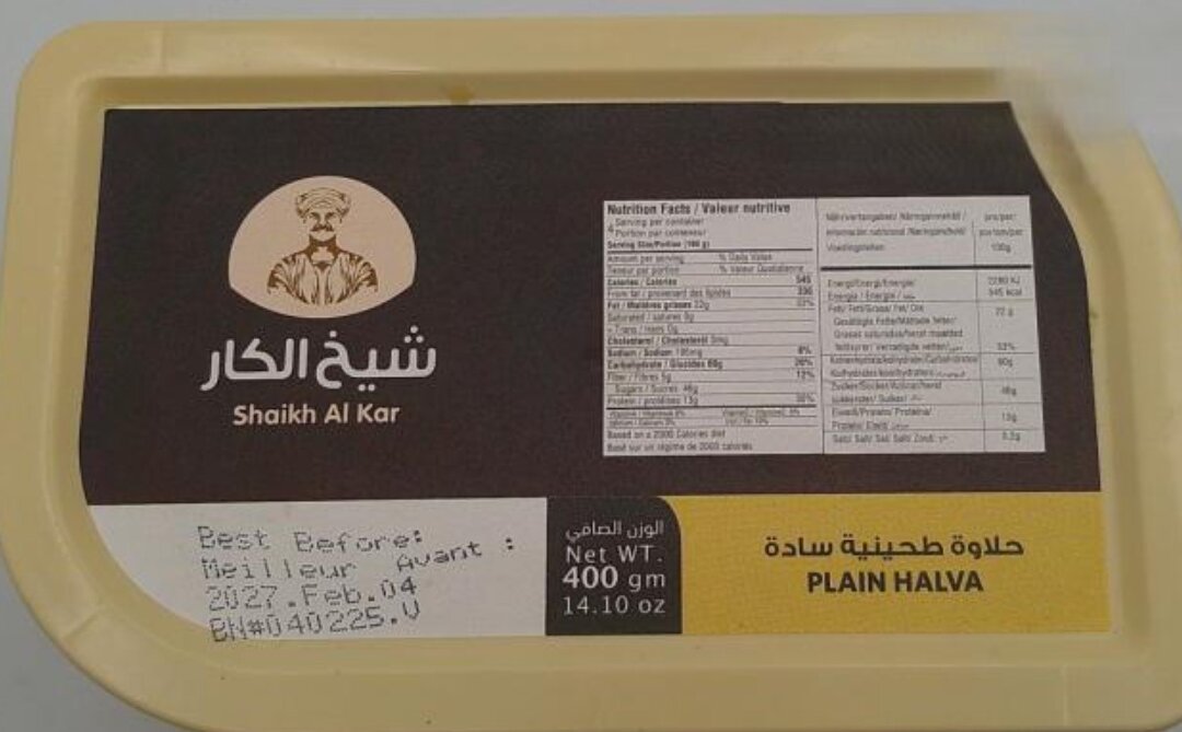 The Canadian Food Inspection Agency issued a recall order for Shaikh Al Kar brand Plain Halva on Aug. 28, 2025, saying it contains a risk of salmonella. Handout/CFIA