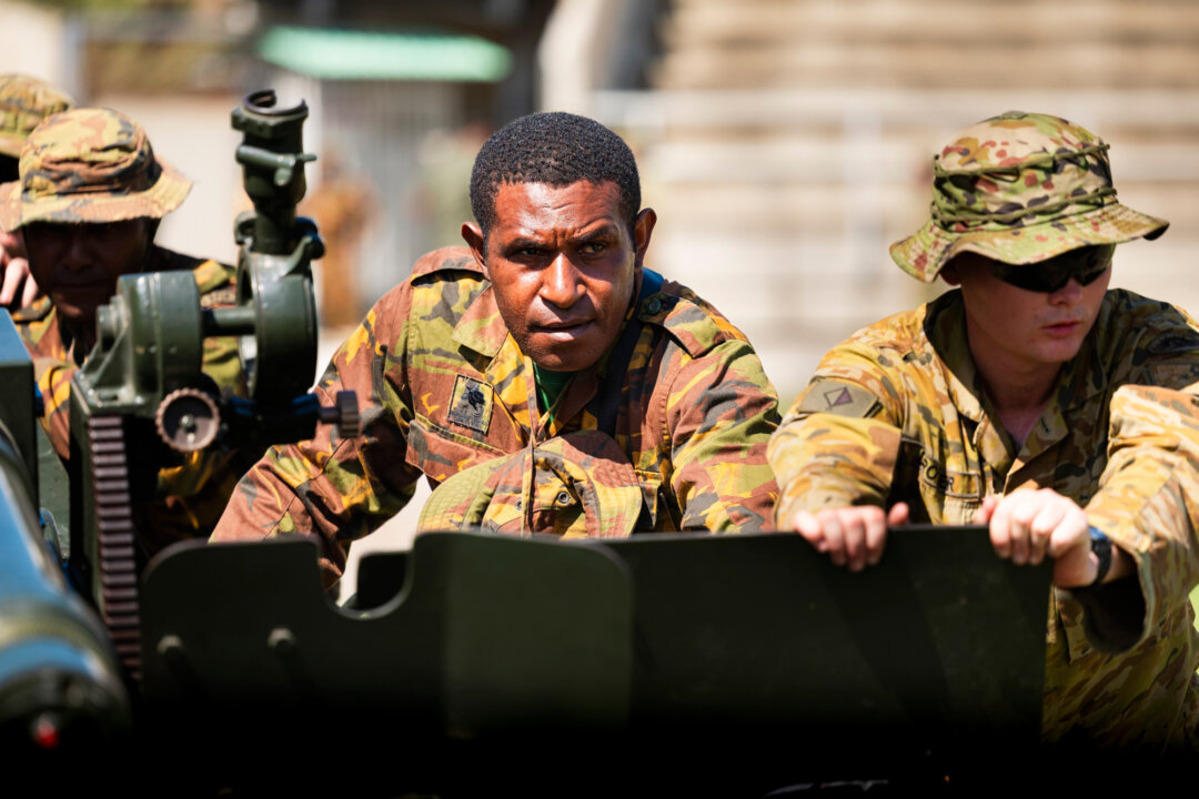 Papua New Guinea Defence Force soldier Lance Corporal Richard Wamp and Australian Army soldier Gunner Reece Drover transport a M2A2 Howitzer gun at Sir Hubert Murray Stadium in Port Moresby, Papua New Guinea. Courtesy of the Australian Department of Defence