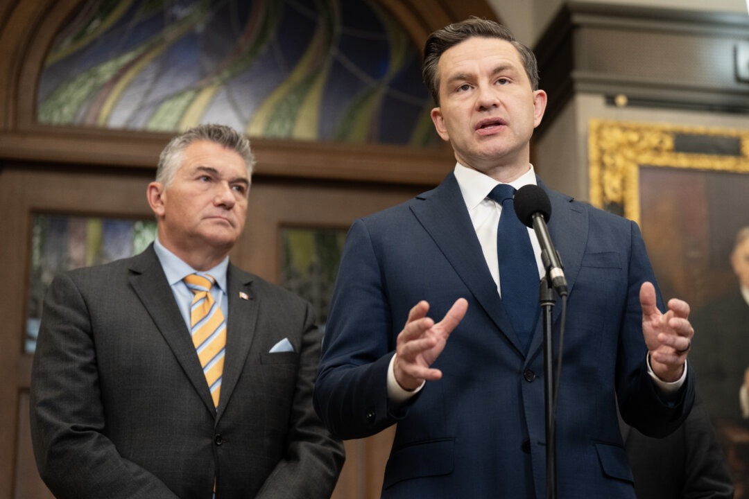 Conservative Shadow Minister for National Defence James Bezan looks on as Leader of the Conservative Party Pierre Poilievre speaks with reporters in the Foyer of the House of Commons in Ottawa on June 9, 2025. The Canadian Press/Adrian Wyld