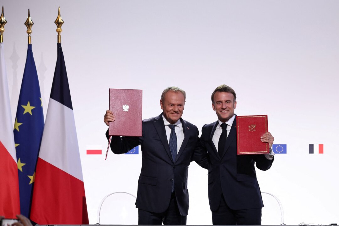 French President Emmanuel Macron and his then-Polish counterpart Donald Tusk sign a Friendship and Strategy Treaty in Nancy, France, on May 9, 2025. Christophe Petit Tesson/Pool via Reuters