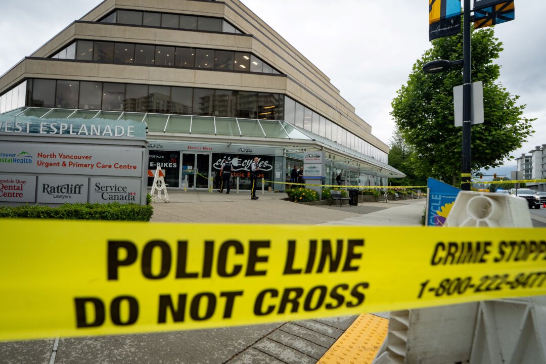 RCMP officers wait outside of MLA Bowinn Ma’s office after a security incident early in the morning, in North Vancouver, B.C., on June 27, 2025. The Canadian Press/Ethan Cairns