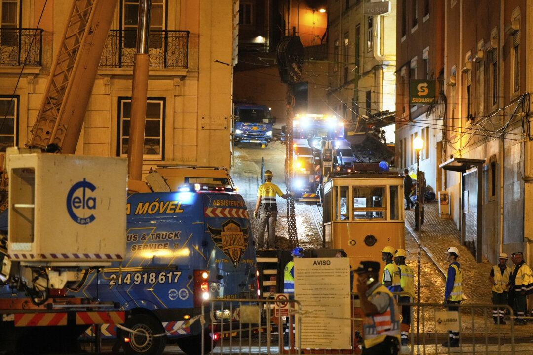 Cranes are positioned to remove the wreckage of a tourist streetcar that derailed and crashed in Lisbon, on Sept. 4, 2025. AP Photo/Ana Brigida