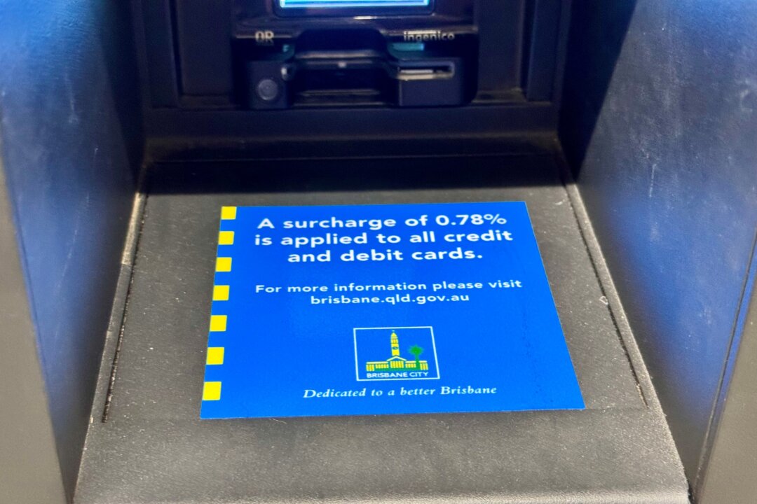 An image of a Brisbane City Council parking payment machine—with a notice about card surcharges—under King George Square in Brisbane CBD, Australia on Dec. 7, 2024. Daniel Y. Teng/The Epoch Times
