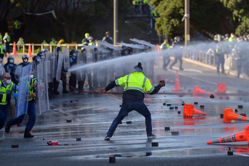 A man faces off with police near the Parliament as law enforcement move in to clear protesters in Wellington, New Zealand on March 2, 2022. Dave Lintott/AFP via Getty Images