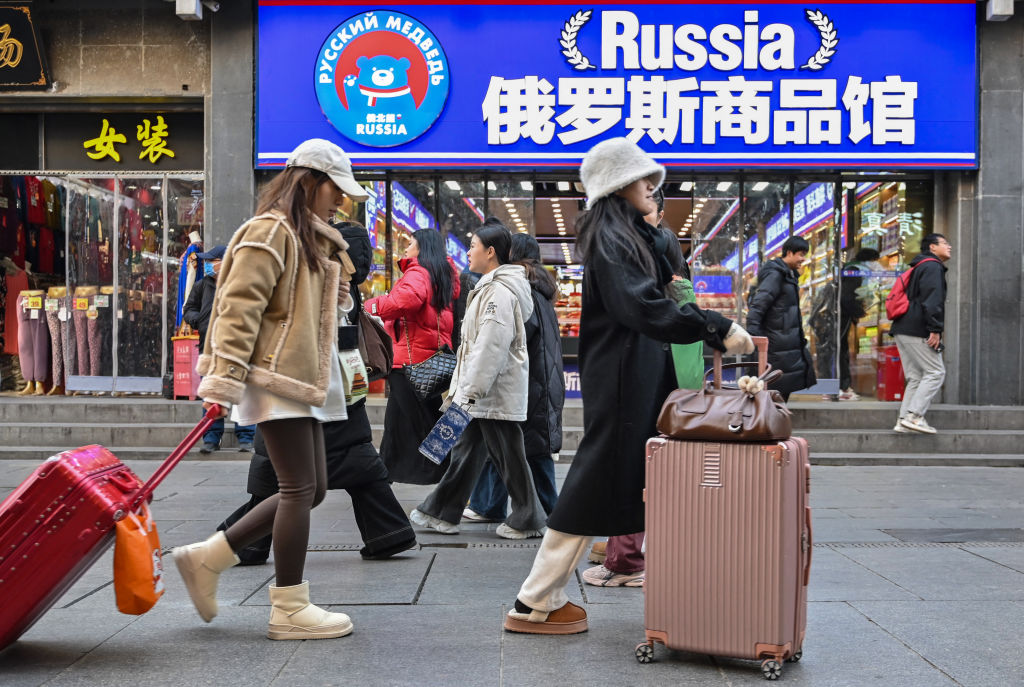 People walk past a store selling goods from Russia in the popular Qianmen tourist area in Beijing on Jan. 13, 2025. Adek Berry/AFP via Getty Images