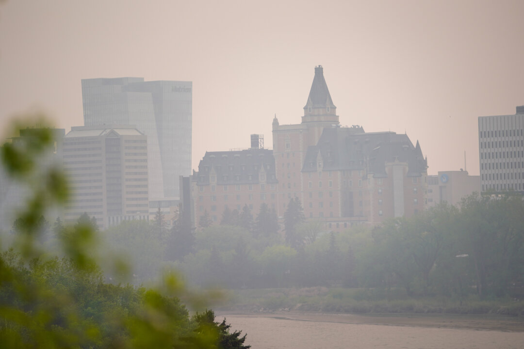 The Delta Hotels Bessborough is photographed through thick smoke from wildfires burning across the Prairies, in Saskatoon, Sask., on May 20, 2023. The Canadian Press/Heywood Yu