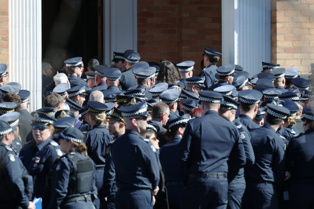 Police members and mourners arrive for the funeral service for Victoria Police officer, Senior Constable Vadim De Waart-Hottart in Melbourne, Sept. 5, 2025. AAP Image/David Crosling