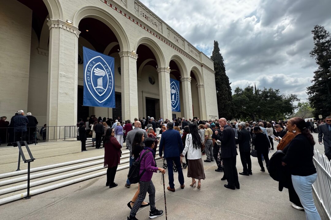 Show goers line up at Pomona College’s Bridges Auditorium ahead of a Shen Yun performance in Claremont, Calif., on March 30, 2025. (The Epoch Times)