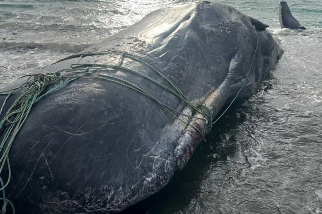 The whale’s ability to feed was restricted by a rope wrapped tightly around its jaw.