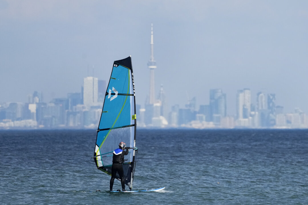 A windsurfer cuts through the waves along Lake Ontario overlooking the City of Toronto skyline on a warm winter day in Mississauga, Ont., on Feb. 9, 2024. The Canadian Press/Nathan Denette
