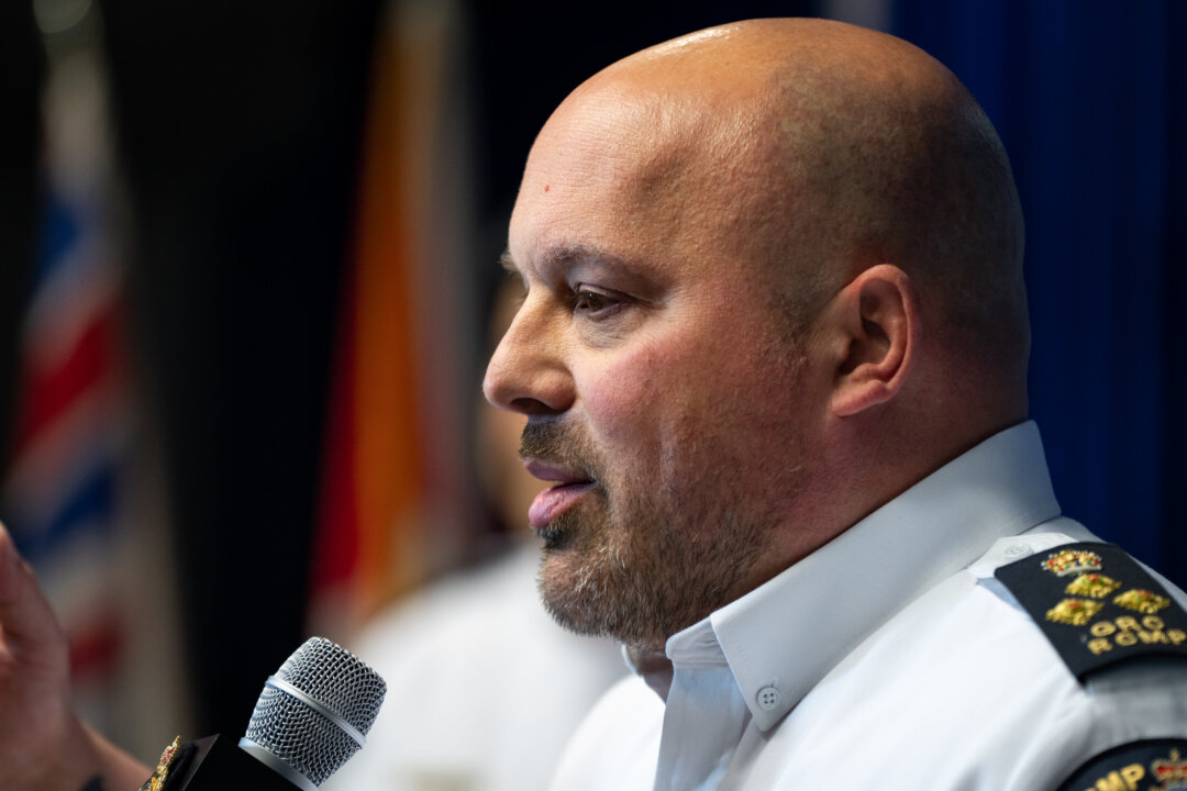 Assistant Commissioner David Teboul speaks during an RCMP news conference announcing fentanyl production labs that have been dismantled around British Columbia, in Surrey B.C., on April 10, 2025. THE CANADIAN PRESS/Ethan Cairns