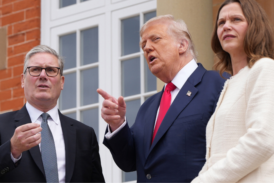 British Prime Minister Sir Keir Starmer (L) and his wife, Lady Victoria Starmer (R), are greeted by U.S. President Donald Trump (C) at his Trump Turnberry golf course in South Ayrshire, Scotland, on July 28, 2025. Chris Furlong/PA Wire
