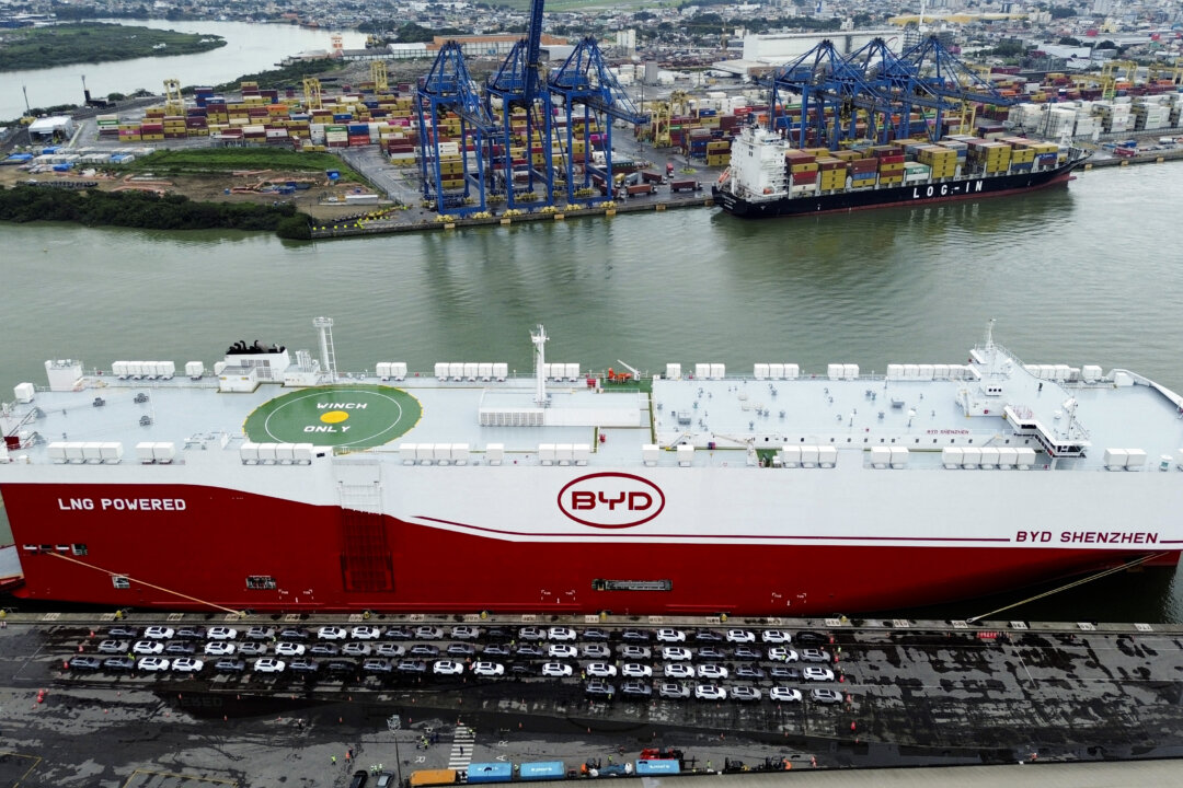 A ship with the logo of BYD, a Chinese company, delivers vehicles at the Port of Itajaí in Santa Catarina, Brazil, on May 28, 2025. Anderson Cohelo/Reuters