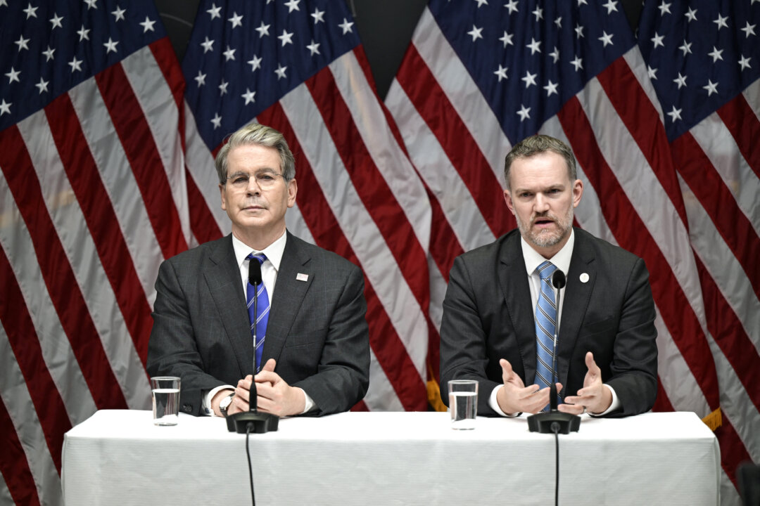 Treasury Secretary Scott Bessent (L) and Trade Representative Jamieson Greer address a press conference in Rosenbad after the trade talks between the United States and China concluded, in Stockholm, Sweden, on July 29, 2025. Magnus Lejhall/TT News Agency/AFP via Getty Images