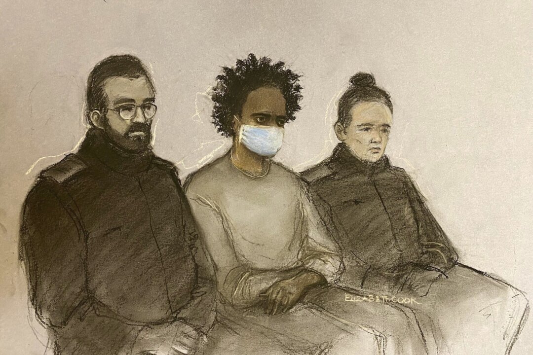 In this sketch, Southport stabbings suspect Axel Rudakubana appears on the first day of his trial at Liverpool Crown Court in England on Jan. 20, 2025. Elizabeth Cook, artist/PA via AP