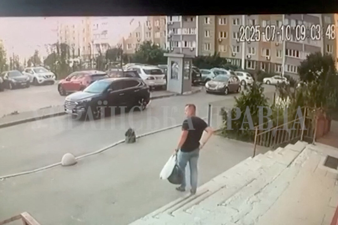 Footage reportedly shows a Security Service of Ukraine (SBU) officer just before he was shot in Kyiv on July 10, 2025. Ukrainska Pravda/via Reuters