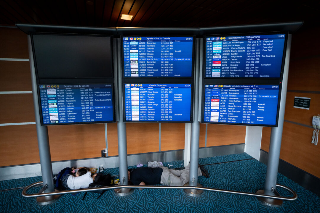 People sleep under a flight information board at the Vancouver International Airport in Richmond, B.C., on Aug. 16, 2025. The Canadian Press/Ethan Cairns