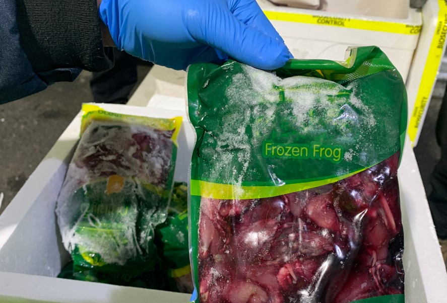 Authorities say the woman carried out a deceptive operation by declaring pork, fruit and vegetables, frog meat and raw prawns as other items.