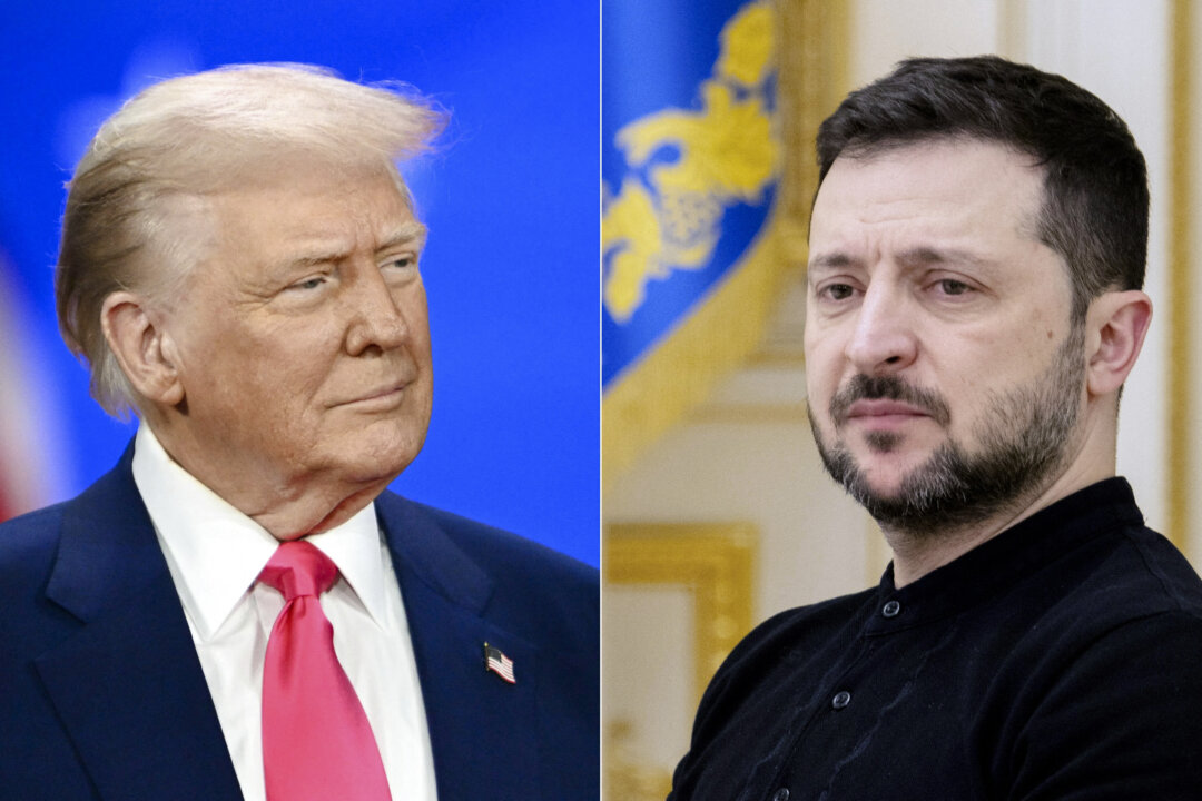 (Left) U.S. President Donald Trump on Feb. 22, 2025. (Right) Ukraine’s President Volodymyr Zelenskyy on Feb. 12, 2025. Alex Wroblewski and Tetiana Dzhafarova/AFP via Getty Images